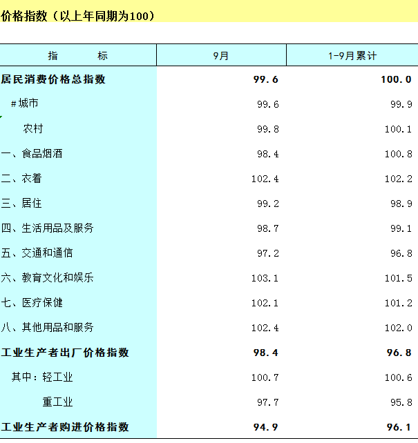2023年1-9月广西价格指数(以上年同期为100)