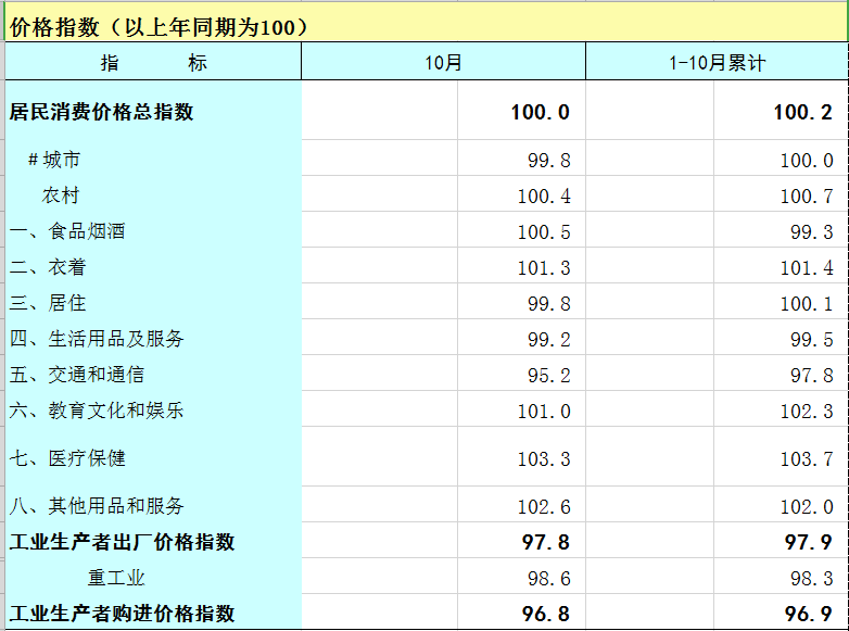 2024年1-10月广西价格指数(以上年同期为100)