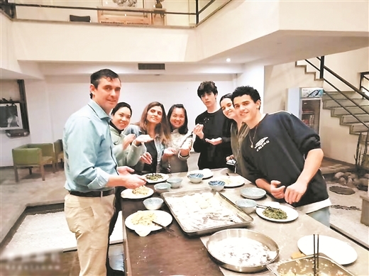 入住桂林和舍湖畔度假民宿的外国游客在体验包饺子。