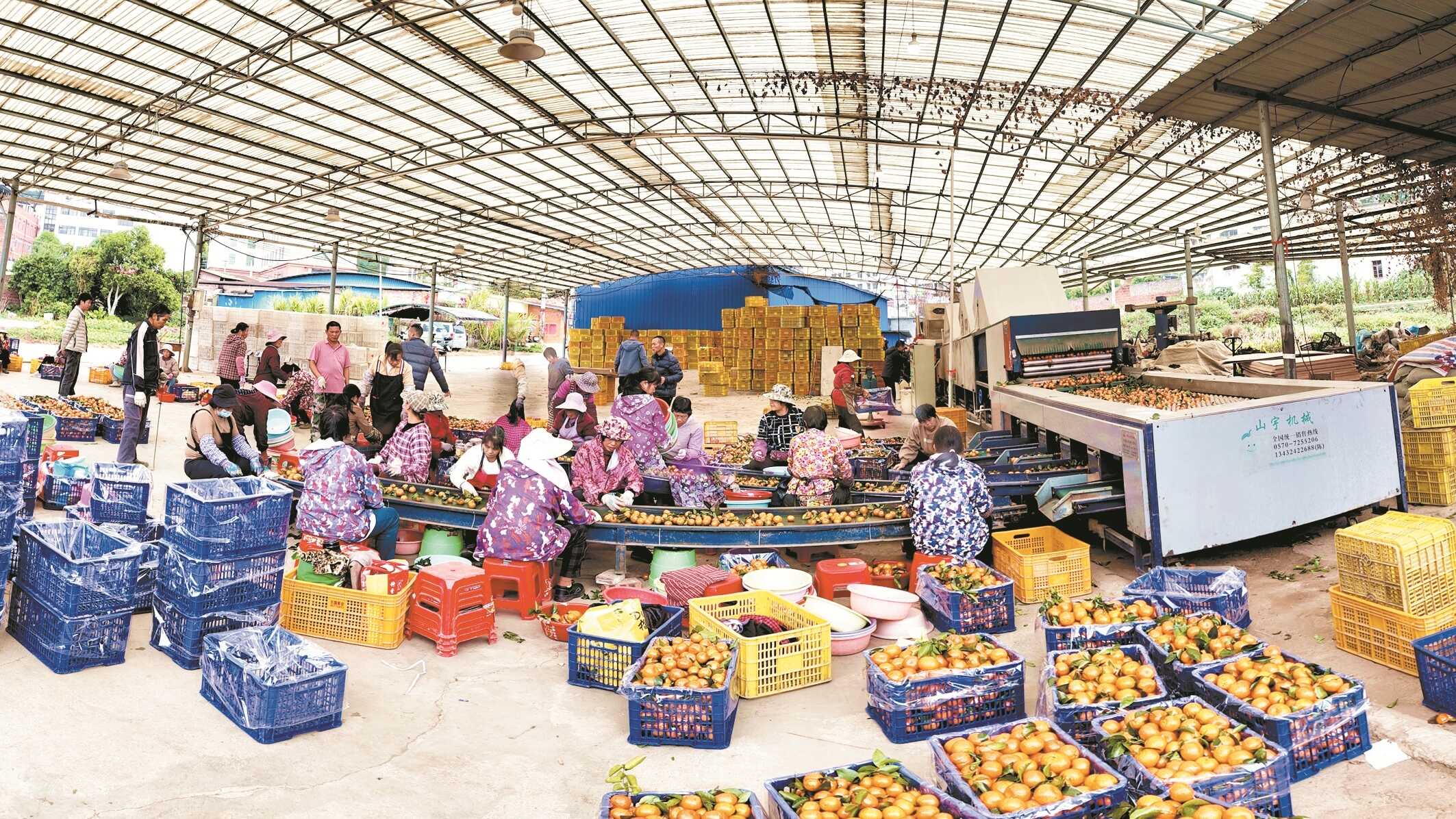 在蒲塘镇水果集散中心,工人正在分拣砂糖橘。