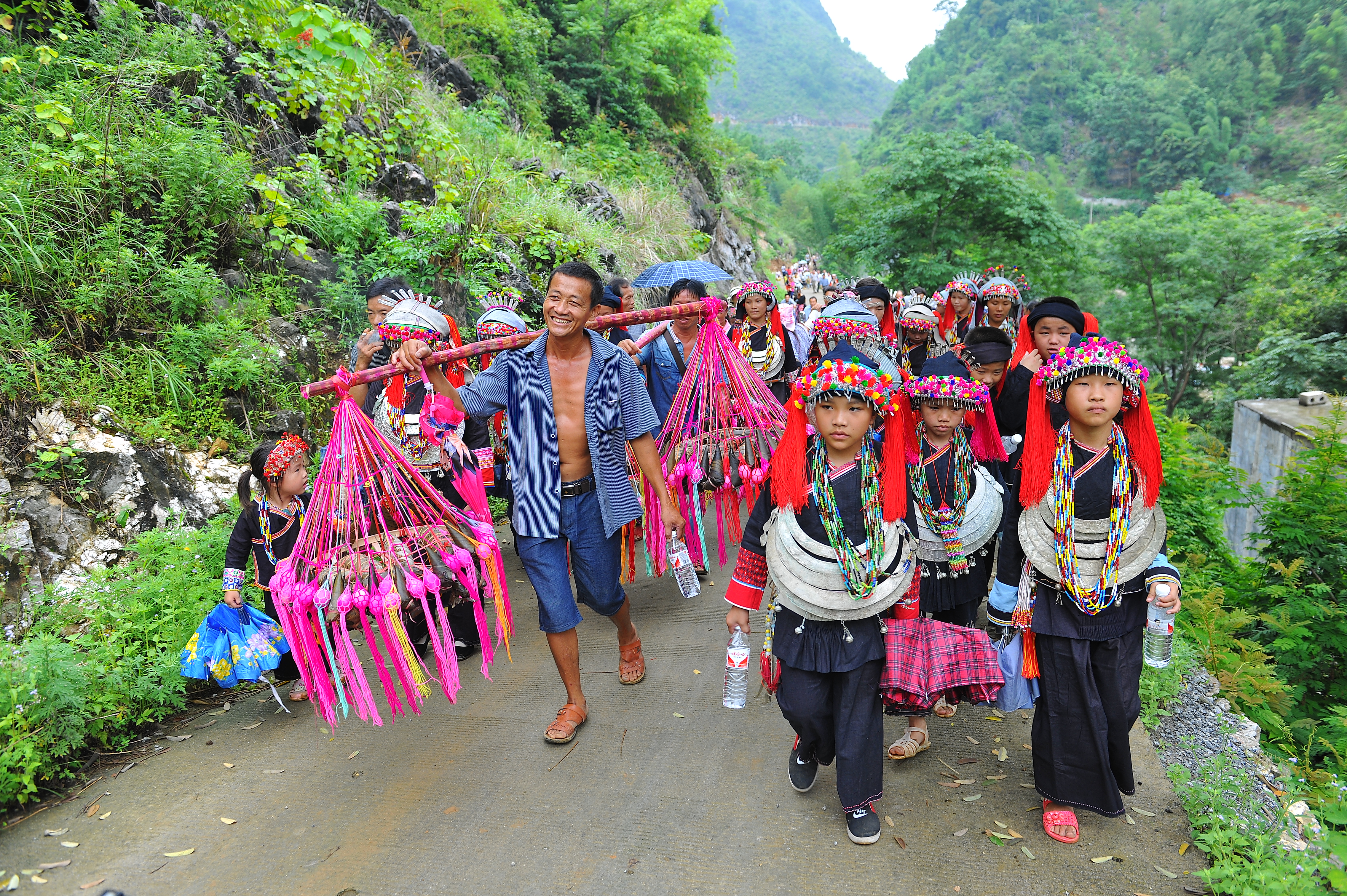 瑶族祝著节于每年农历五月二十九日举行,瑶族民众为纪念密洛陀生日,以祭祀祈福、打铜鼓、打陀螺、射弩、唱细话歌等为内容,相聚欢庆三天,周边村寨的壮、汉、仫佬、毛南等其他民族群众也共同参与。其中,祭祀祈福在节庆核心文化场所番岭山举行,男女老少着盛装,背铜鼓,携贡品,由当地德高望重老者“卜机”率众祭拜天地,纪念始祖。番岭山公祭结束后,人们敲响铜鼓,由“卜机”念诵《密洛陀》,讲述其创世造人的故事,并嘱导人们勿忘先祖之恩,当行孝顺之道,同时牢记瑶族的迁徙历程与不忘劳苦的奋斗精神。
