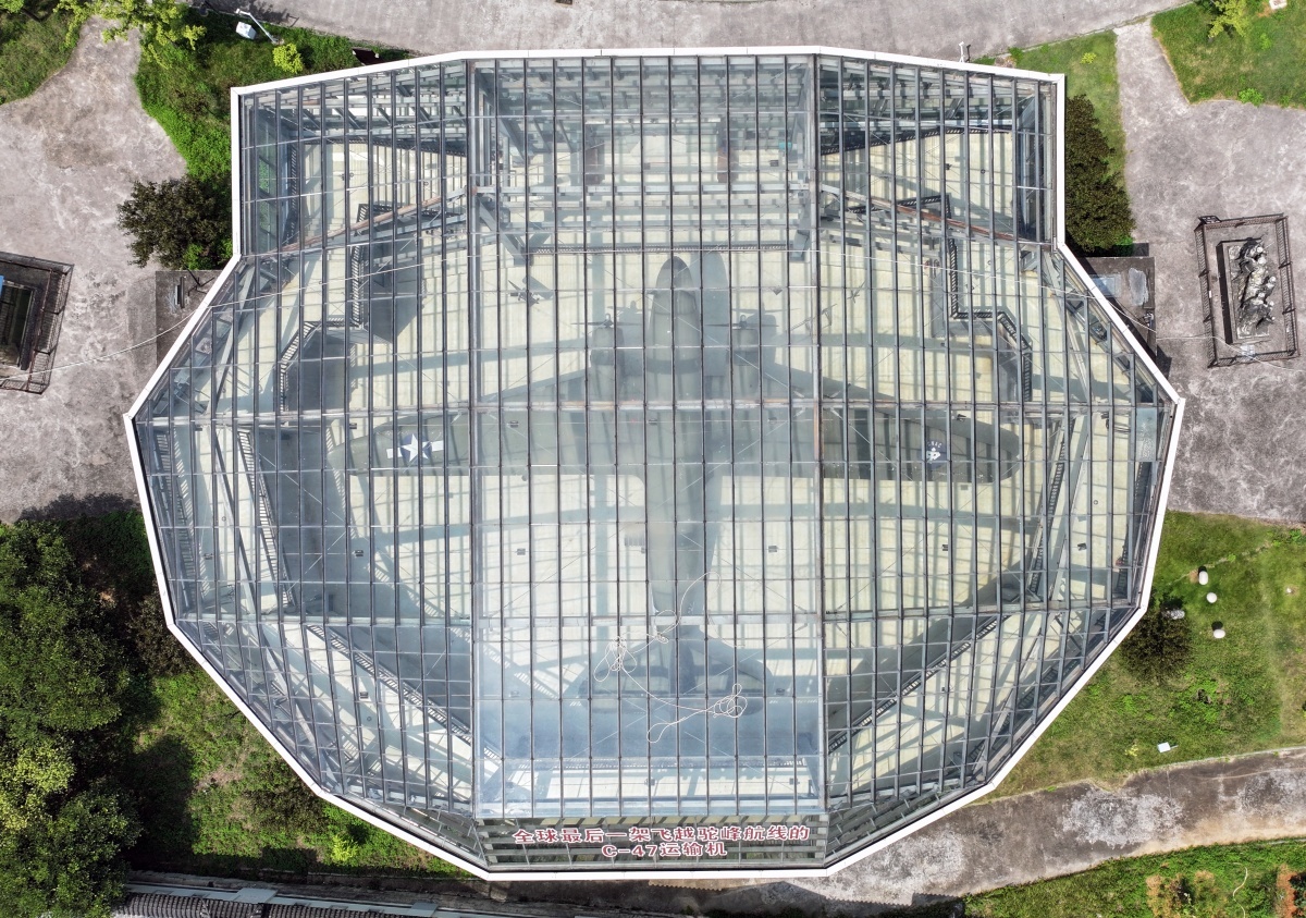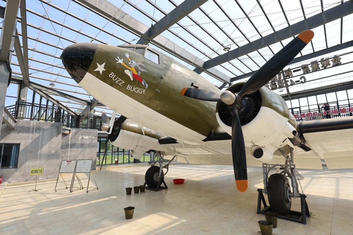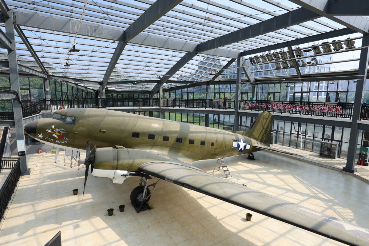 美国飞虎队桂林遗址公园飞机馆内,展陈着全球最后一架飞越驼峰航线的C-47飞机。