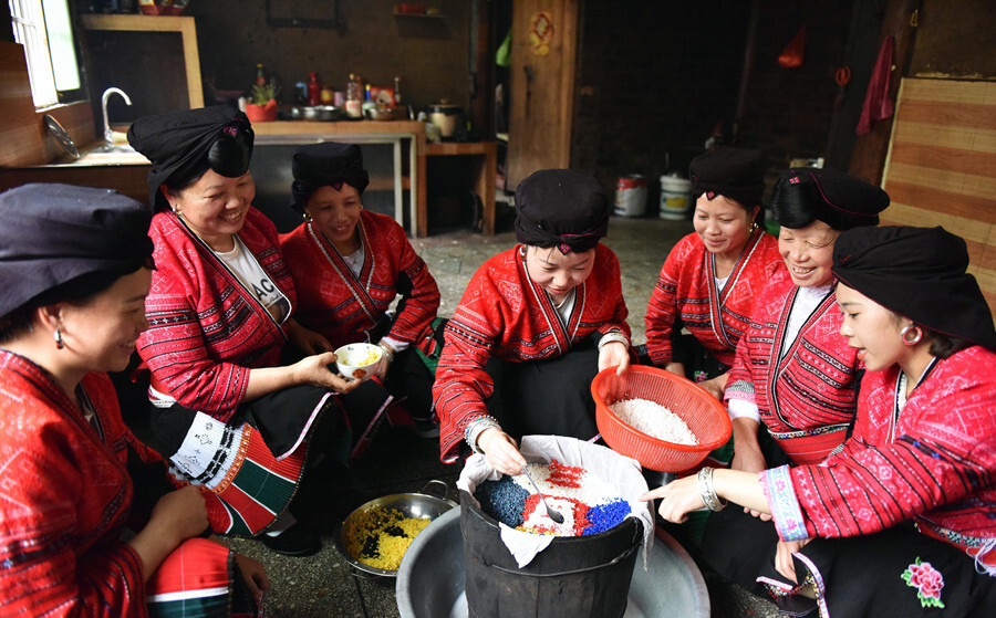 村民们相邀一起制作五色糯米饭。吴生斌 摄
