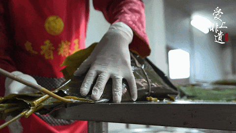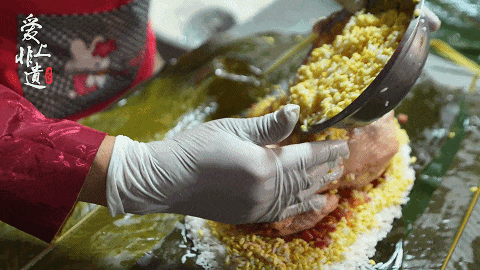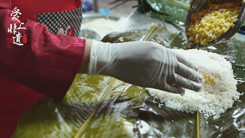 包粽也是个学问,要恰到好,不松不紧,煮粽时才不会松散。以传统的“腩肉大粽”为例,包粽时,需要先把粽叶叠好放平,粽子一般包三层,第一层铺糯米,第二层裹绿豆,第三层放五花腩肉。最后再放上糯米覆盖,用粽叶包成两头扁平、中间隆起的梯形,再用线绳捆好。