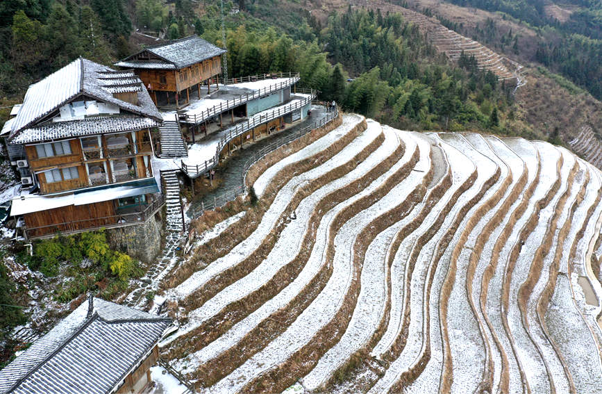 2月20日,广西桂林市龙胜各族自治县龙脊梯田迎来今年首场降雪。放眼望去,皑皑白雪把层层叠叠的梯田和当地错落有致的吊脚楼装扮成一幅瑞雪兆丰年的壮丽景观,美不胜收。(陈燕 潘志祥 潘勇干)