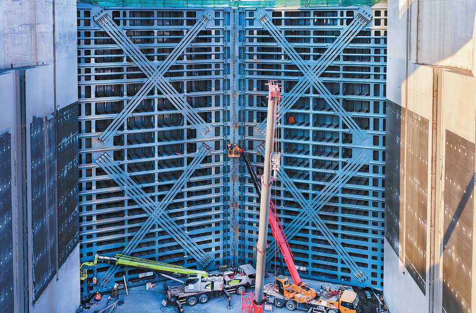3月18日,记者走进马道枢纽,只见工程吊篮悬于半空,工人紧贴门体施工,渺小身影与巍峨闸墙形成强烈反差,一柔一刚间,更显工程壮阔与建设者的坚守。
