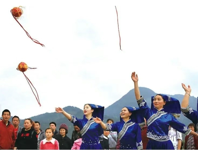 “抛绣球”是广西三月三歌圩或传统佳节中的一项传统活动,主要通过转、甩、抛、接等动作,将绣球传递出去,以起到娱乐身心、沟通感情的作用。抛绣球从原先作为男女之间传情达意的表达方式的基础上不断发展,到如今成为竞技性群体娱乐活动,集民间体育与娱乐于一体,具有广泛的群众基础,并兼具民族性、趣味性。