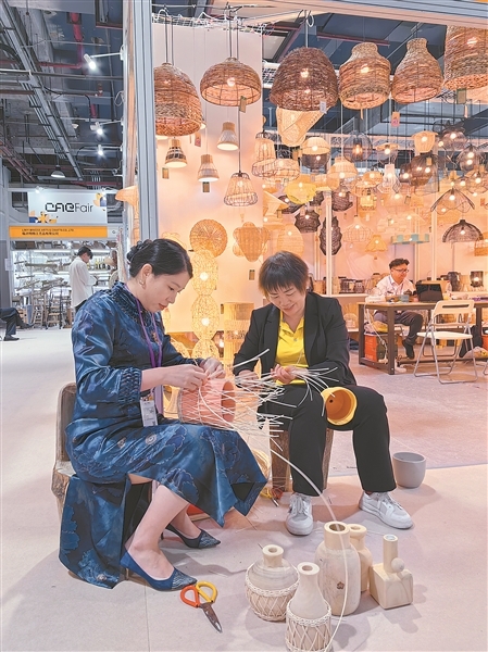 在广交会上,黄连将(左)现场演示花盆编织技艺。(受访者供图)