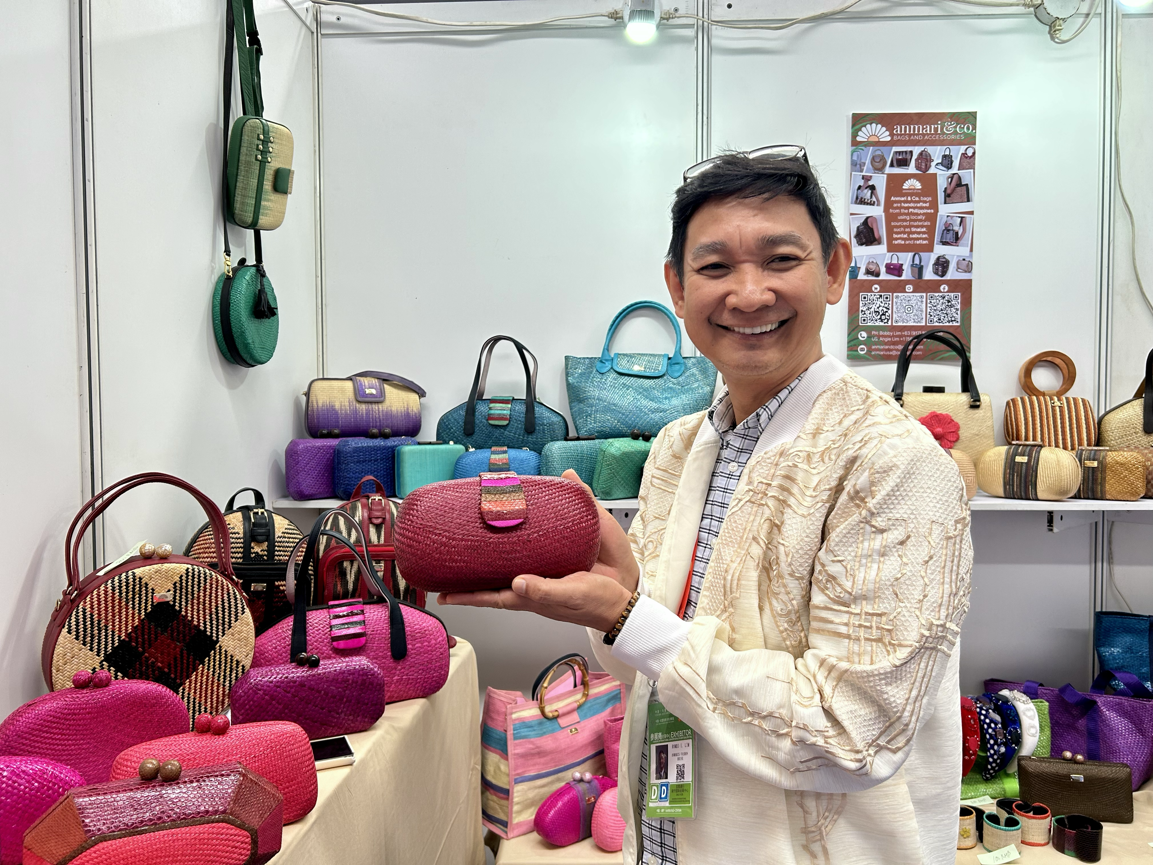 在菲律宾馆,参展商展示特色手工编织包袋。万一鸣 摄