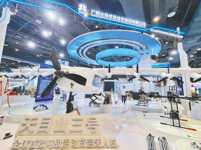 展厅里,一架白色无人机引人注目,这是广西北投低空经济投资有限公司带来的天目空卡TMS-3,为吨级混动货运无人机,展现出低空经济领域的硬核实力。该公司携“低空黑科技”亮相本届东博会,从“空中监管大脑”到“农村低空快递”,从大载重无人机到智慧物流枢纽,每个展位都亮点十足。