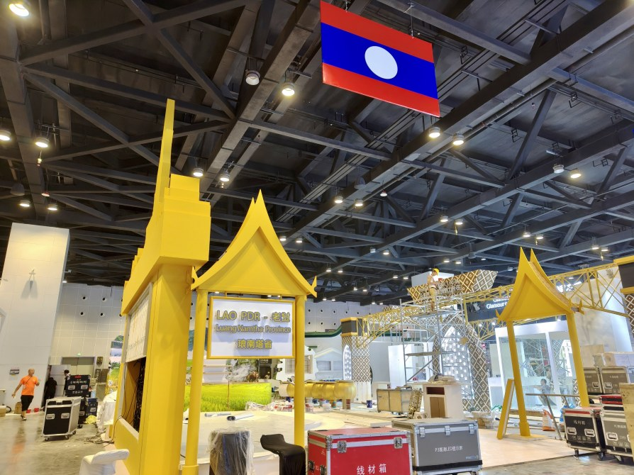 琅南塔省位于老挝北部,那里有瀑布、原始森林等自然景色和传统村落。展区以金黄色为主色调,建筑造型呈现独特的老挝风貌。展区中央,设计了一个大舞台,工作人员介绍,展会期间将安排文艺表演,展现老挝风情,让观众感受其文化魅力。