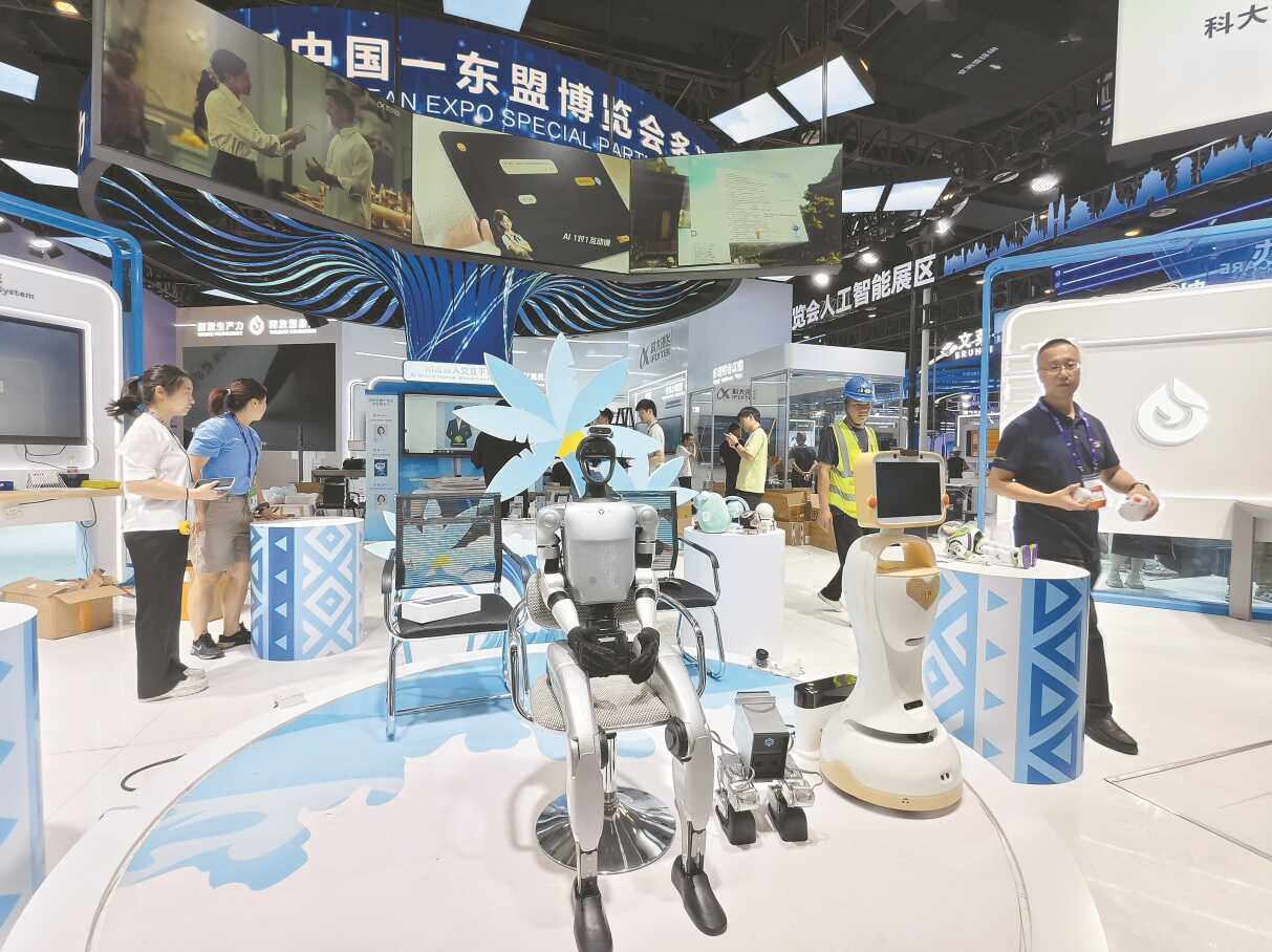 9月15日,在东博会人工智能展区,工作人员正在调试各款机器人。徐天保 摄