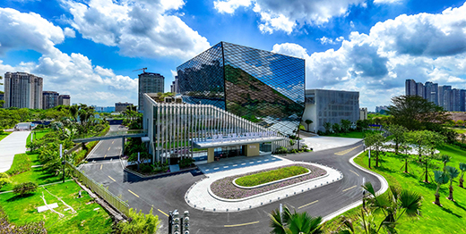 高空俯瞰,中国—东盟国家人工智能应用合作中心(简称“南A中心”)展示中心在阳光照射下,如一枚闪亮棋子,嵌在五象新区的苍翠绿意中。