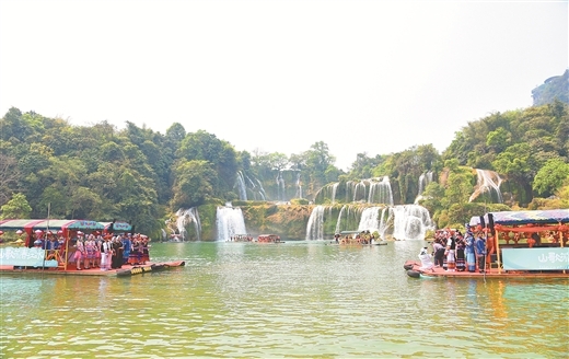 2025年3月26日,中越界河山歌会激情开唱。中越两国山歌手以中越德天(板约)瀑布为背景,乘坐竹筏进行山歌对唱。管林华 雷丽军 摄