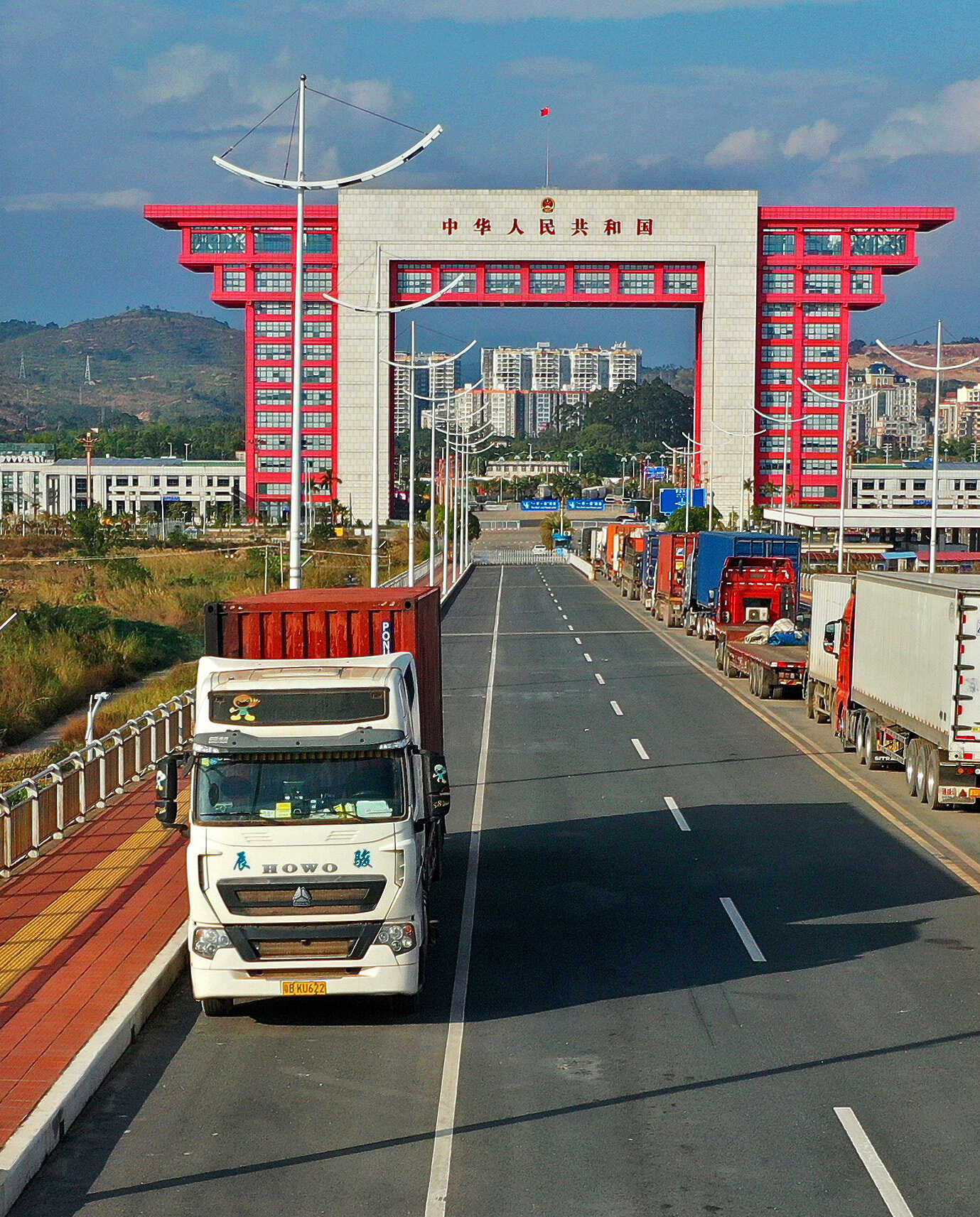 货车有序进出东兴口岸二桥国门楼。周军 摄