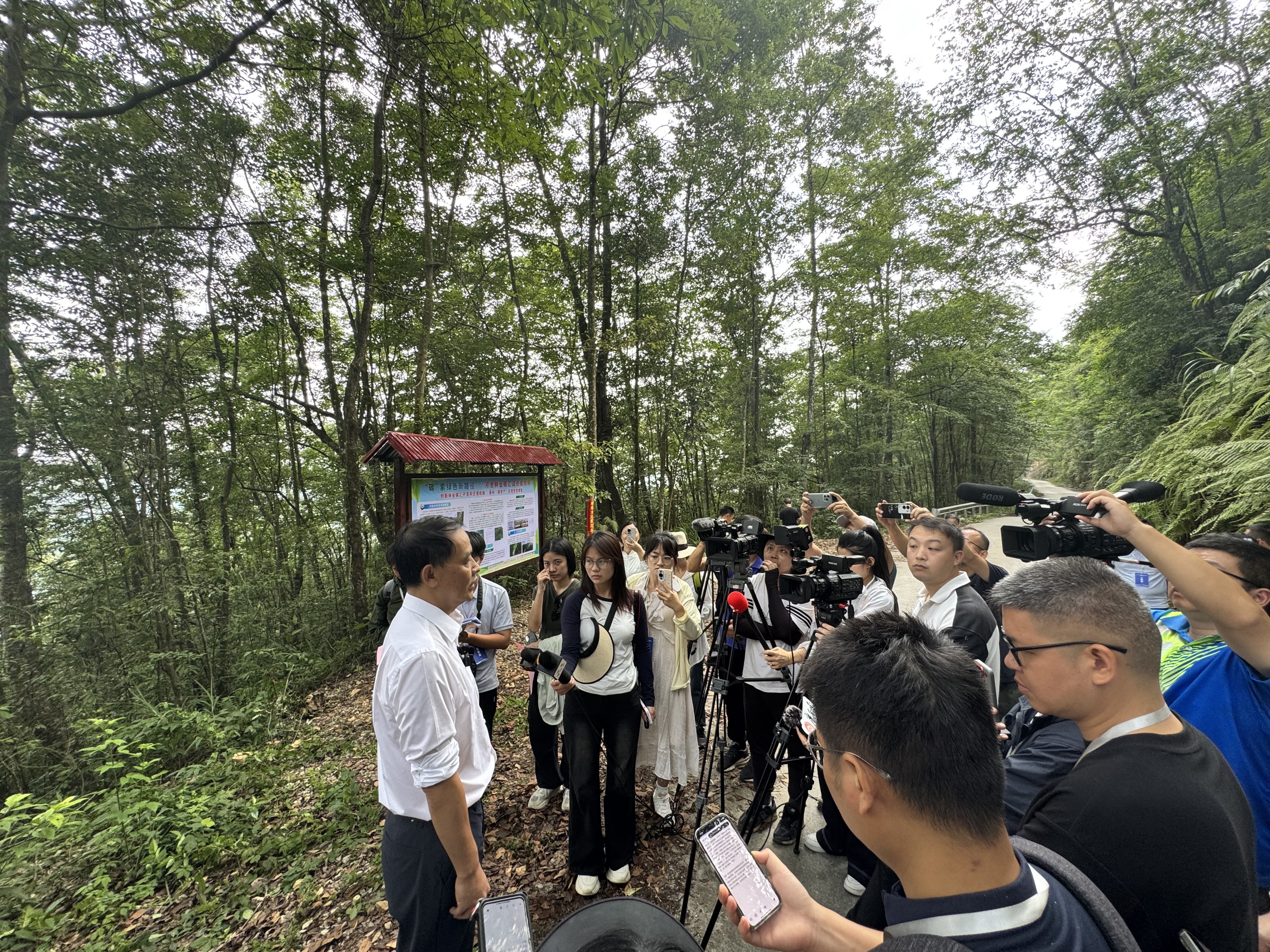 7月9日在环江毛南族自治县华山林场附近碳汇点,河池市林业局负责人接受采访团记者采访。 广西云-广西日报记者 唐绍怡 摄