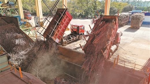 2025年11月29日,广西来宾东糖凤凰有限公司厂区内,运输车将新鲜甘蔗倒入辅助输蔗机槽。