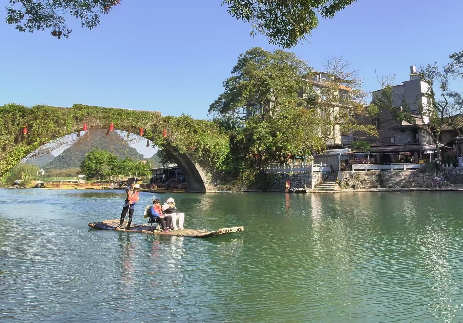 在漓江支流遇龙河上,竹筏已告别“燃油驱动”。记者余锋 摄