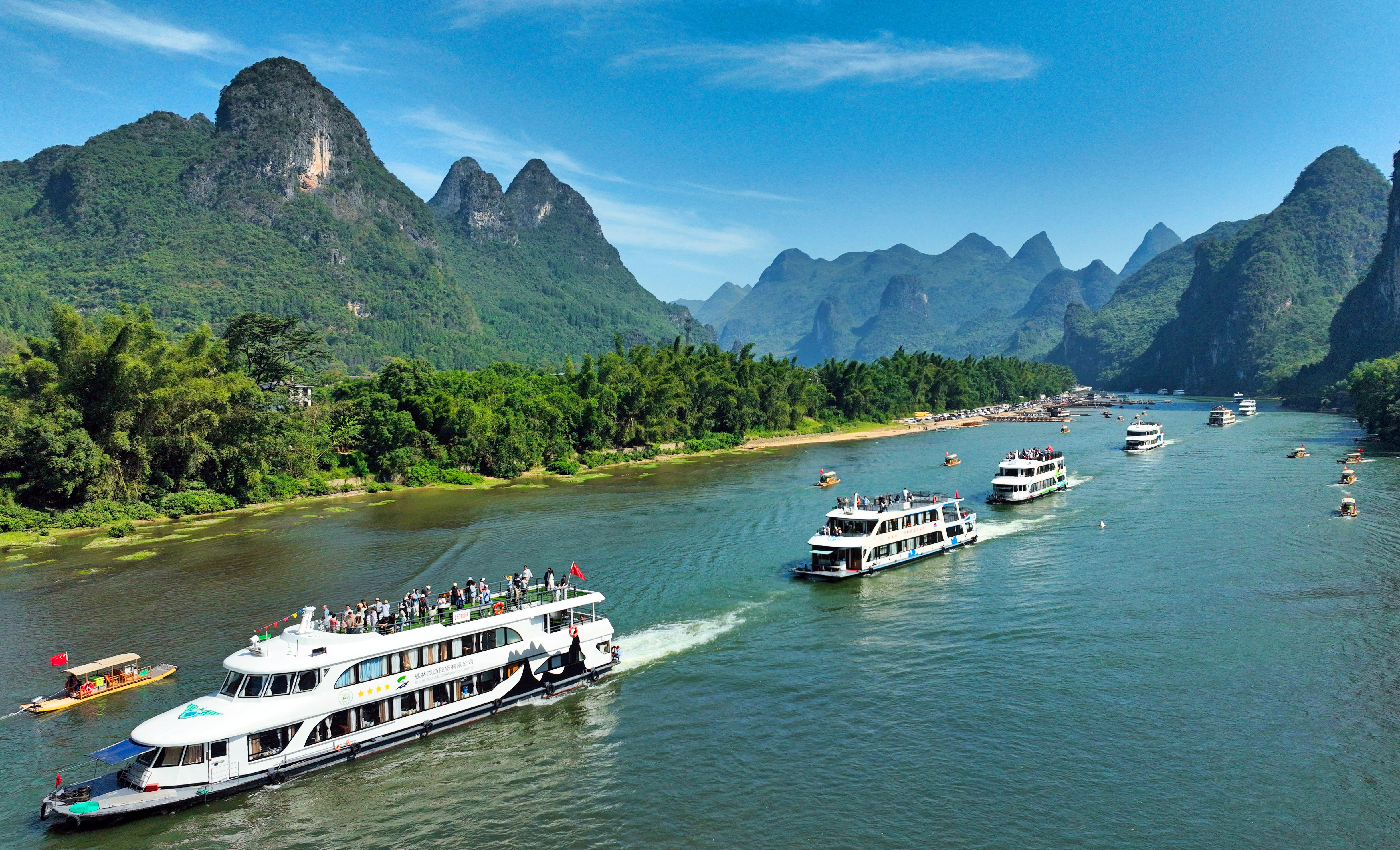 “我们首艘漓江五星级新能源游船早在2021年投运,另有2艘四星级新能源游船正加紧建造,预计明年投入使用。相较于传统柴油动力游船,‘油改电’游船的优势还不少。”桂林旅游股份有限公司漓江游船分公司船队副经理马轶说。游船采用电力推进系统,替代传统柴油动力,可有效减少废气排放,不仅大幅提升环保标准与推进效率,更实现深度节能降耗,提升能源利用效率,从源头上减少对漓江水体与空气的影响,为生态保护筑牢防线。