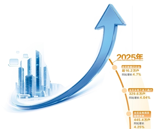 2025年末,全区实有民营经营主体445.4万户,同比增长4.25%。其中,全年新登记民营经营主体60.4万户,是带动经营主体新登记数回升的主要支撑。