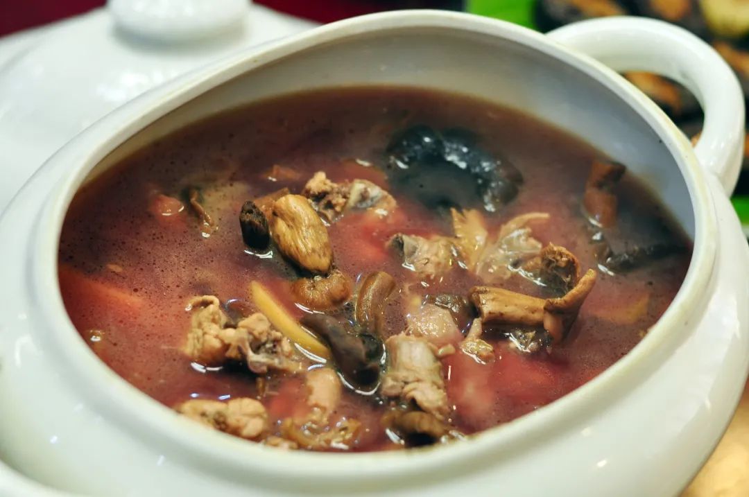特色美食:霞烟鸡、红茹鸡汤、竹笋酿、柚皮酿、腊肉炒木茹、洋鸭汤、枸杞叶汤。▲ 红菇鸡汤 图/容县文体广电和旅游局