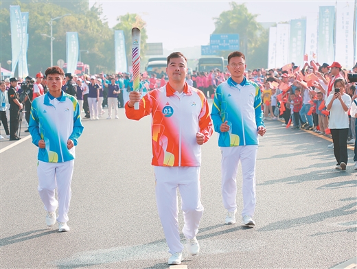 11月4日上午,第一届全国学生(青年)运动会火炬传递到达贵港市。图为第一棒火炬手邓荣虎在传递火炬。熊耀章 摄
