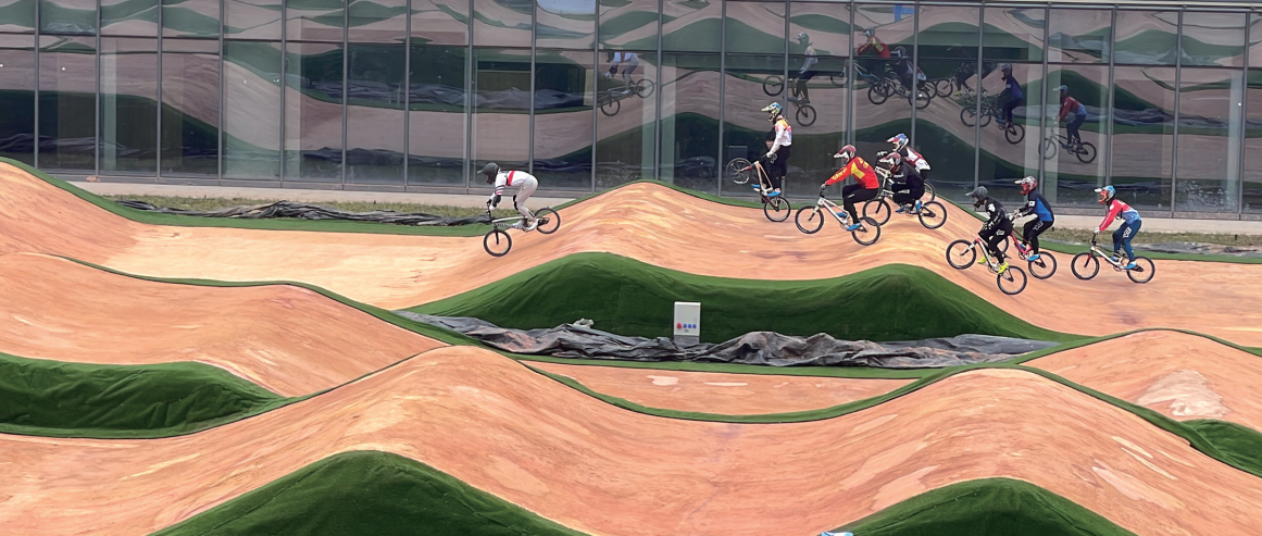 竞速小轮车赛道犹如四条深黄色的飘带。“铛铛铛……”随着赛道上挡板拉下,参加测试的运动员骑车径直下冲,飞跃“红土包”,高速过弯,做出俯冲、飞腾、跳跃等一个个惊险刺激的动作。目睹测试现场,记者脑海中已浮现出正式比赛时运动员骑车在赛道中上下翻飞、观众在场边欢呼雀跃的热闹画面。