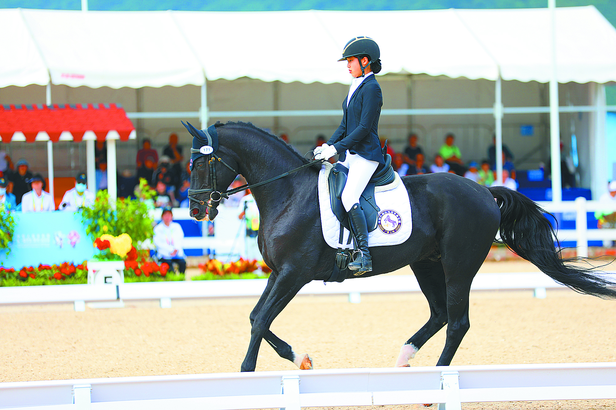 11月5日,首届全国学青会马术比赛在中国大明山马术中央公园开幕。图为选手在赛场上沉着自信、风度翩翩。乔晓莹 韦冰川 摄