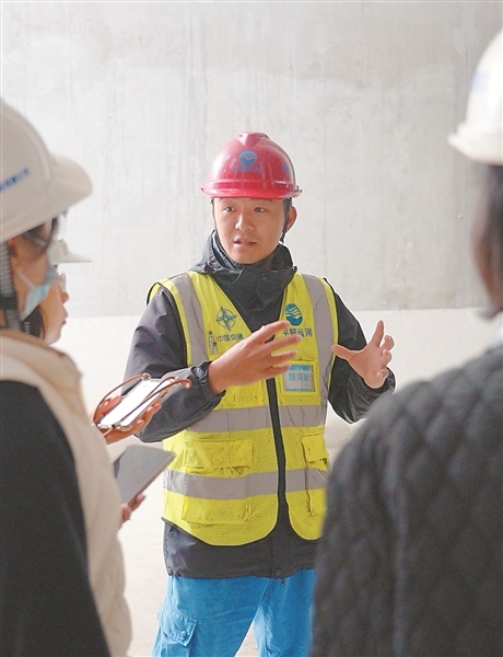 颜荣耿向记者介绍平陆运河马道枢纽省水池内部结构。冯源 摄