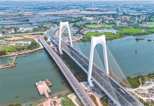 3月31日,平陆运河沙井钦江大桥建成通车。该桥全长896米、主跨270米,设计时速60公里,桥面宽40米,采用双向8车道,结构安全等级一级,通航净高19.1米、通航净宽234米,可满足运河5000吨级船舶安全通航需求。