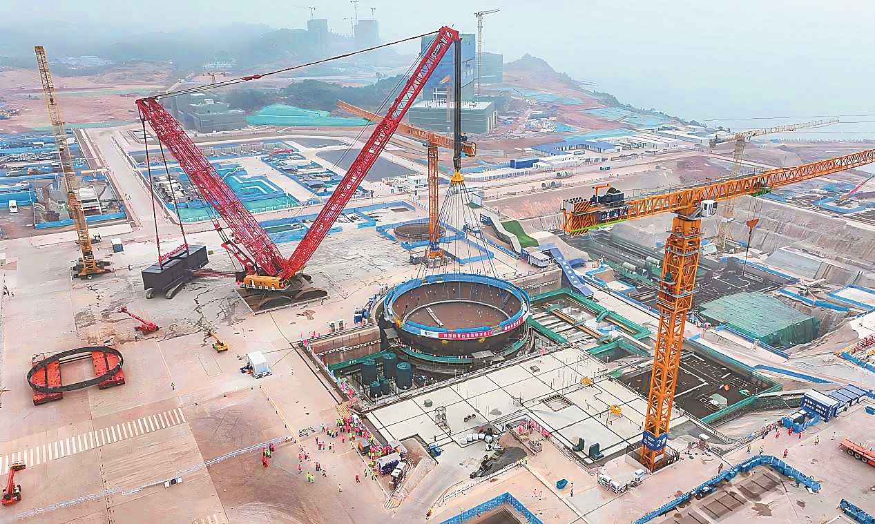 2月6日11时37分,广西白龙核电1号机组核岛钢制安全壳底封头吊装就位。韦程彬 摄