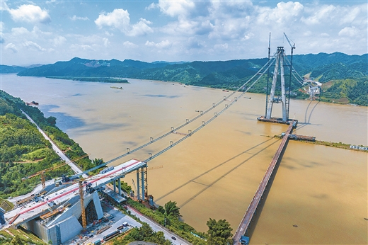 8月6日,在平南至岑溪高速公路藤州浔江特大桥,工人们正加紧施工。该桥是平岑高速控制性工程,是世界上首座独塔斜拉——悬吊协作体系桥,全长1.58公里,计划投资10.43亿元。目前大桥主塔已经封顶,其他工程建设稳步推进。黄胜林/摄