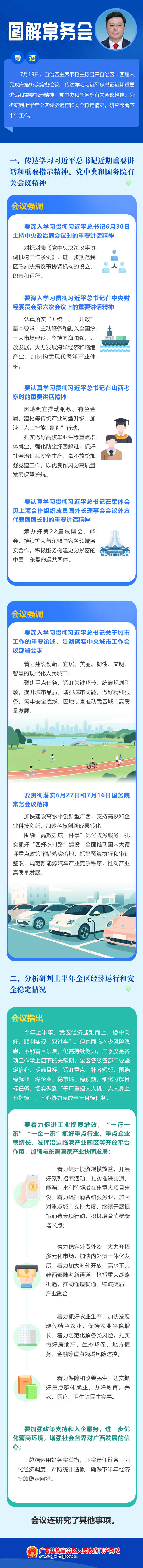会议强调,要贯彻落实6月27日和7月16日国务院常务会议精神,加快建设高水平创新型广西,支持高校和企业科技创新,加速科技创新成果转化;围绕“高效办成一件事”优化政务服务,扎实抓好“四好农村路”建设,全面推动国内大循环重点政策举措落实落地,抓好预算执行和审计整改,规范新能源汽车产业竞争秩序,推动产业高质量发展。