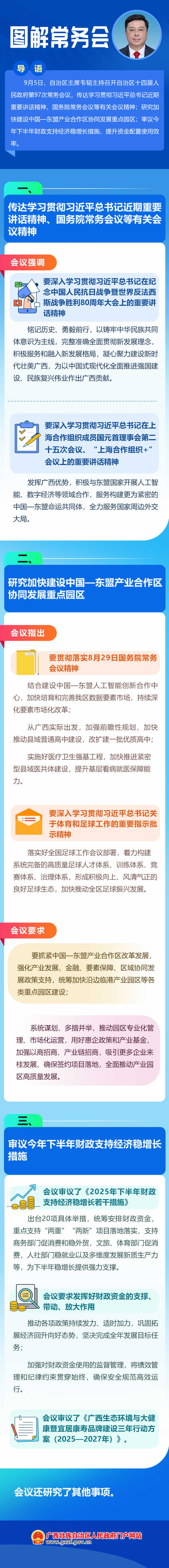 9月5日,自治区主席韦韬主持召开自治区十四届人民政府第97次常务会议,传达学习贯彻习近平总书记近期重要讲话精神、国务院常务会议等有关会议精神;研究加快建设中国—东盟产业合作区协同发展重点园区;审议今年下半年财政支持经济稳增长措施,提升资金配置使用效率。
