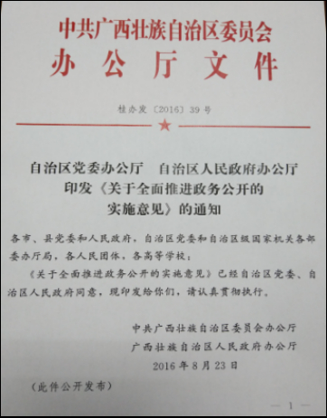2016年2月,中共中央办公厅 国务院办公厅印发《关于全面推进政务公开工作的意见》(中办发〔2016〕8号),明确了今后一段时期政务公开工作目标和方向。2016年7月,自治区党委书记彭清华在自治区党委全面深化改革领导小组第十二次全体会议研究政务公开工作时指出:要坚持推进行政决策公开、执行公开、管理公开、服务公开和结果公开,以公开透明推动简政放权、放管结合、优化服务改革,以公开透明赢得人民群众的理解、信任和支持,以公开透明释放市场活力、增强企业内生动力,以公开透明提高政府治理能力和公信力;推进政务公开要不断深化行政审批制度改革,优化审批流程,真正让企业和群众办事更方便、更快捷、更满意。自治区主席陈武在2016年政府工作报告中强调:深入推进依法行政,全面履行政府职能,规范行政权力,强化严格执法,加快建设法治政府,全面推行政务公开,提高政府公信力和执行力。自治区领导在重要会议上对全区推进政务公开工作作出了总体部署。