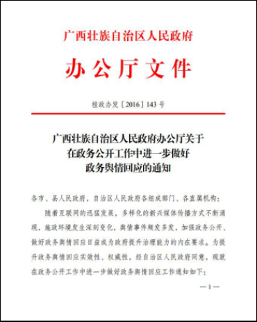 按照国务院办公厅要求,出台了《广西壮族自治区人民政府办公厅关于在政务公开工作中进一步做好政务舆情回应的通知》(桂政办发〔2016〕143号),从政务舆情回应的主体、范围、平台建设、机制建设、保障措施5个方面,对全区各级各部门在政务公开工作中加强政务舆情回应提出了系统性的具体要求,初步建立了政务舆情回应协调督办机制,明确了相关部门的回应责任、时效等相关问题。特别是对涉及特别重大、重大突发事件的政务舆情,规定承担舆情回应主体责任的各有关部门在向上级报告的同时,应第一时间向社会发布已掌握的事实类信息,原则上不超过1小时。