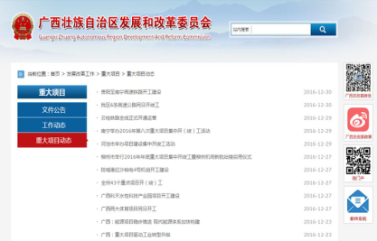 各市也积极利用新闻发布会、网站、电视、报纸等多种形式公开重大建设项目信息,自觉接受社会监督。如,2016年11月10日,南宁市召开新闻发布会通报重大项目建设情况,南宁市2016年自治区层面和市级层面统筹推进重大项目包括新开工、续建、竣工投产和前期工作(预备)四类,共496项(含增补),总投资5312.13亿元,年度计划投资641.36亿元。其中,自治区层面重大项目96项,总投资2186.45亿元,年度计划投资268.37亿元;市级层面重大项目400项,总投资3125.68亿元,年度计划投资372.99亿元。玉林市2016年共办理重大项目审批285件,总投资约149.46亿元,其中:项目建议书批复89件,可研批复35件;初步设计批复30件,核准项目9件,备案项目19件,其他项目延期核准1件,招投标核准45件,节能审查47件。