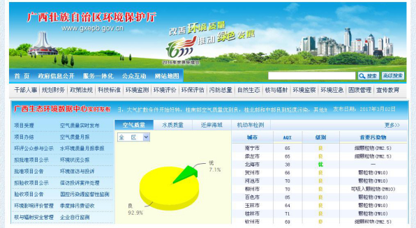 ——环境保护信息公开。2016年5月,正式将“广西环保”微信公众号中的“环境地图”上线至微信钱包中的“城市服务”平台,公众可以更便利地查询广西环境质量实时监测数据。一是推进空气和水环境信息公开。通过网站、“广西环保”APP等实时发布全区14个设区市空气质量指数(AQI)值、空气级别、首要污染物等监测数据,每月公开14个设区市空气质量排名。每日发布区域空气质量预警预报信息,并根据空气质量提醒健康注意事项,为群众出行和工作提供参考。实时发布国控和省控水质自动监测站监测断面水质达标情况,每月定期发布水环境质量信息,内容包括地表水环境质量、城市集中式饮用水水源地水质、“水十条”考核断面水质状况。二是推进近岸海域及入海河流环境监测信息公开。实时发布北部湾近岸海域16个海洋监测浮标监测结果,组织自治区海洋环境监测中心站每年度开展3次(枯水期、丰水期、平水期)近岸海域环境质量监测,相关监测信息在获取监测数据20个工作日内通过网站对外公开。三是推进污染源环境监管信息公开。在网站公开重点污染源基本信息、污染源监测、总量控制、污染防治、排污费征收、监察执法、环境应急等信息。每季度通过网站公开全区11家装机总容量30万千瓦以上火电厂污染源在线监控设备有效性审核结果,及全区国家重点监控企业监督性监测、在线比对监测结果,督促企业正常运行环保设施,做到达标排放。四是推进建设项目环境影响评价信息公开。及时公开建设项目环境影响评价文件受理情况、拟作出的审批意见、审批决定,建设项目竣工环保验收受理情况、拟作出的验收意见、验收决定等信息,全文公开建设项目环境影响报告书、环境影响评价批复文件等信息,做到环评受理、审批、验收全过程公开。五是推进环境违法案件及查处信息公开。在网站公开环保专项整治行动及环境违法企业信息,将违规企业名单及其环境整治信息向全社会公开。按照中央环保督察要求,各市公开中央环保督察组交办的32批2341件群众举报环境问题查处情况。对查实的环境问题,责令整改1739件,立案处罚176件,罚款总金额865万元,查封扣押22件,关停取缔147件,立案侦查6件,拘留10人,问责351人,约谈企业204家,所有信息均在市县辖区媒体上公开。在广西电视台、广西新闻等自治区主流媒体上公开中央环保督察发现的典型违法案例,群众反响强烈,形成强大的宣传和震慑作用。每月公开全区环保违法违规建设项目清理进展情况,具体到企业名称、项目名称、生产状况、开工建设时间、存在问题、清理措施、拟完成时限、责任单位、完成情况。六是推进核与辐射信息公开。在网站公开辐射类建设项目受理、审批、验收等信息,定期公告辐射安全许可证核发决定。全区辐射环境质量数据每天上报环境保护部,由环境保护部统一公示。