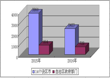 2016年,全区各级行政机关通过网络、传真、信函和当面申请等形式共受理政府信息公开申请3151件,比上年减少了1353件,下降33%。其中,14个市共受理了2423件申请,自治区政府部门共受理了728件。