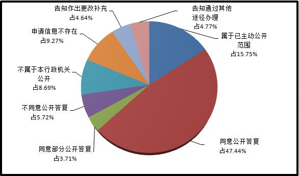 (二)申请受理情况。2018年,全区受理的3873件政府信息公开申请中,已办结3796件,其中按时办结3713件,依法延期办结83件。其余77件申请按照《条例》规定转至2019年度办理。在已答复的3796件申请中,属于已主动公开范围的有598件,占总数的15.75%;同意全部公开的有1801件,占总数的47.44%;同意部分公开的有141件,占总数的3.71%;不同意公开的有217件,占总数的5.72%;不属于本行政机关公开的有330件,占总数的8.69%;申请信息不存在的有352件,占总数的9.27%;告知作出更改补充的有176件,占总数的4.64%;告知通过其他途径办理的有181件,占总数的4.77%。