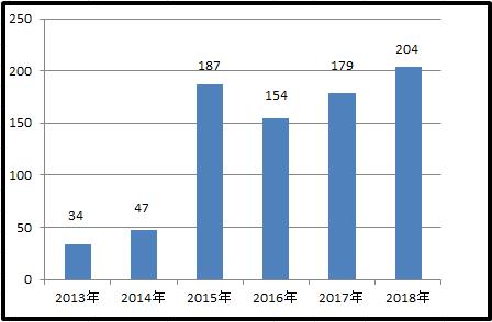 2013-2018年因政府信息公开提起行政复议情况对比图(单位:件)